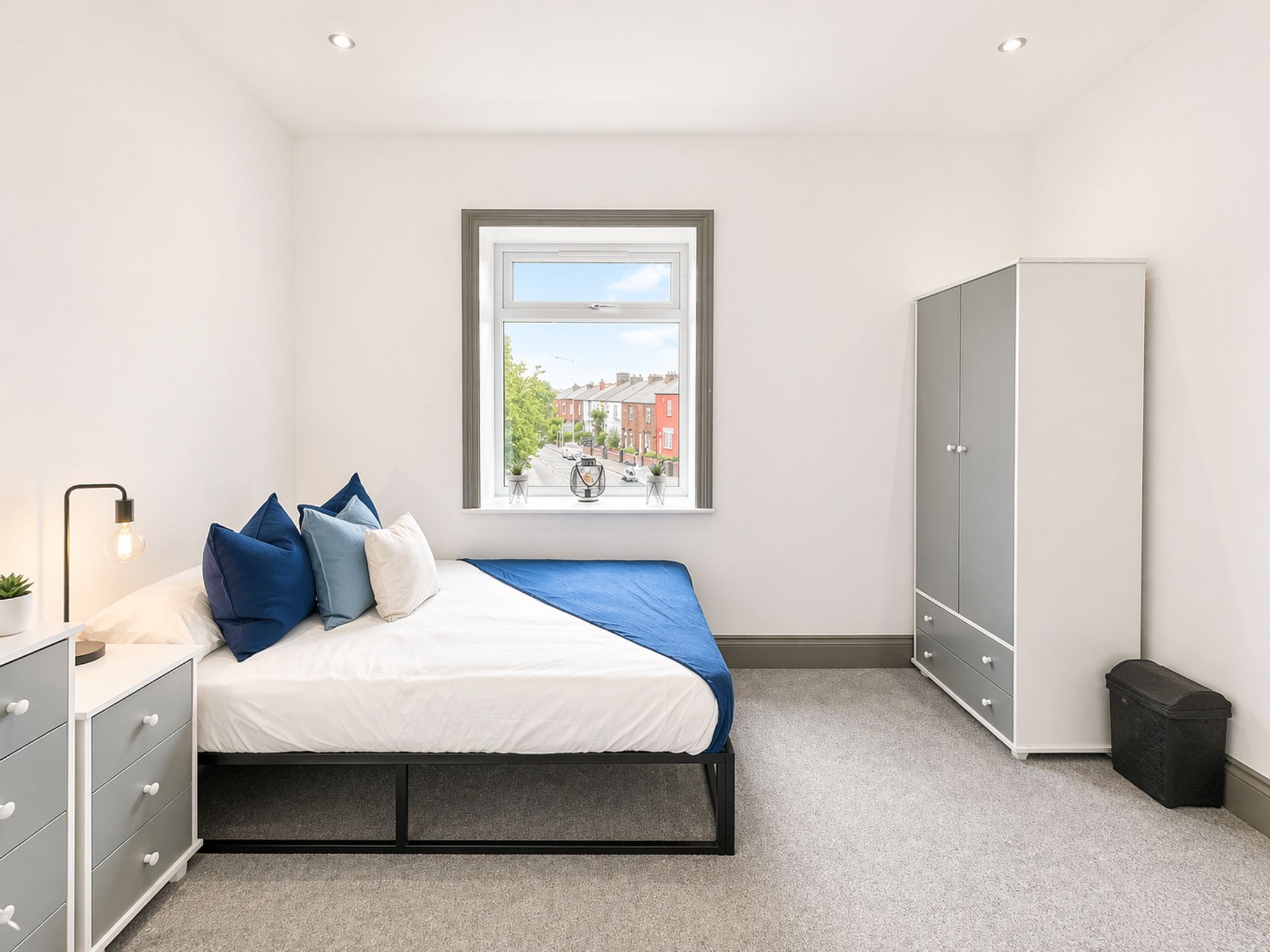 The Double Bedroom is located on the First Floor, and consists of a double bed, mattress, wardrobe, sink and a Modern, Ensuite Shower Room. There are Modern Shared Facilities including Washing Machines and Dryers, and a Communal Kitchen consisting of 2 under-counter fridges, 2 under-counter freezers, 2 integrated ovens and 2 gas hobs. There is a Communal Dining Space for the residents, as well as access to the rear courtyard.